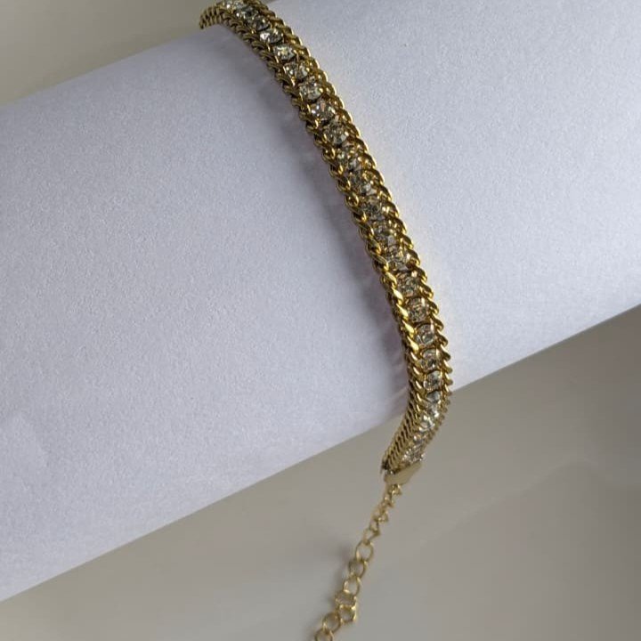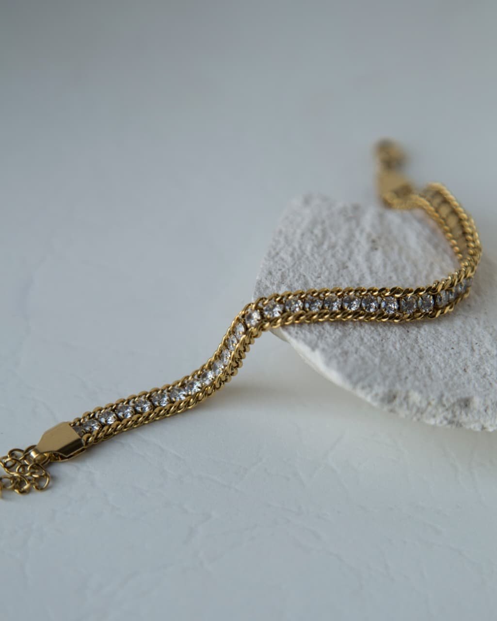 Crafted with woven metal links that interlace beautifully, this chain bracelet glimmers with zircon stones delicately set throughout. The textured weave lends a subtle complexity, while the zircons provide bright sparkle that catches the light with every movement. Comfortable to wear yet striking in its detail, this bracelet balances artisan craftsmanship with glamorous shine—perfect for layering with other pieces or letting stand alone as a signature accent.